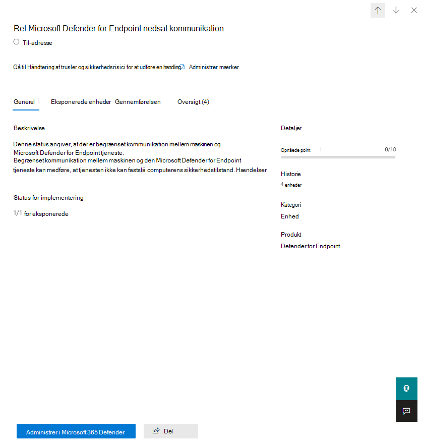 Du kan ikke vælge en status for anbefalede handlinger for Sikker score i kategorien "Enhed", i stedet bliver du dirigeret til den tilknyttede Admininstration af håndtering af sikkerhedsrisici til Microsoft Defender sikkerhedsanbefaling for at handle.
