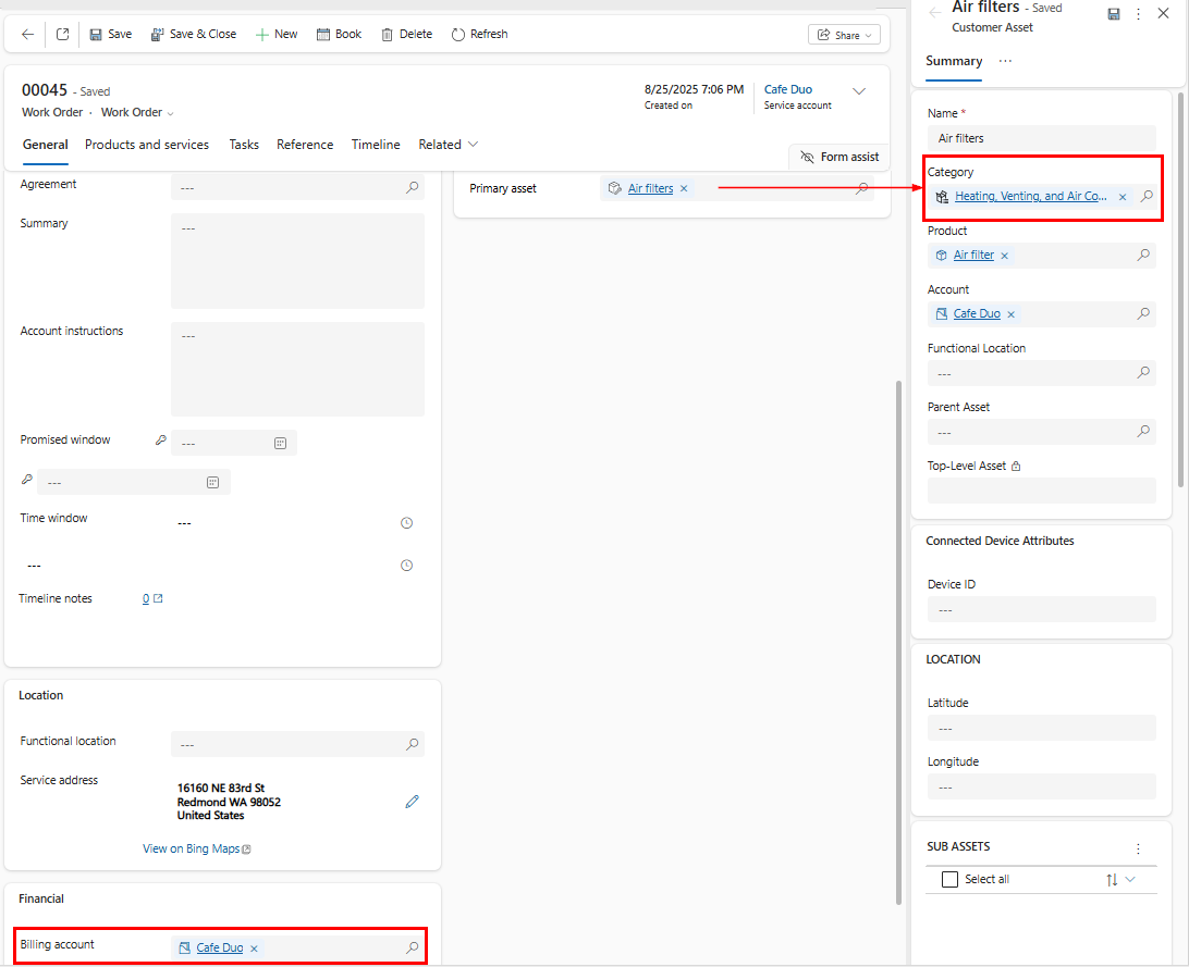 Opret en arbejdsordre. Hvis du vil udløse berettigelsen, skal du sørge for, at faktureringskontoen er den samme som den primære kunde for berettigelsen. Vælg Gem.