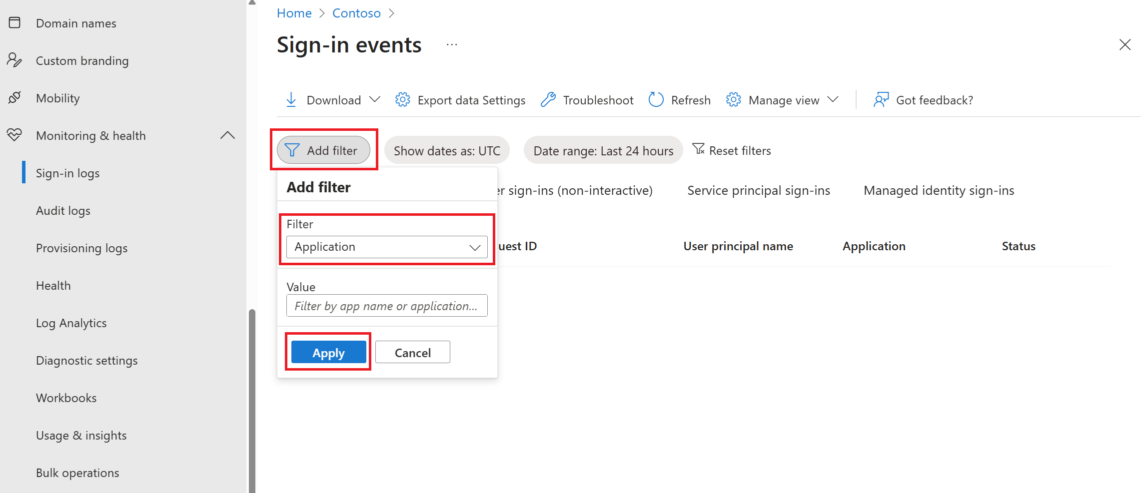 I venstre navigationsrude under Entra ID skal du vælgeLogonloggefor overvågning og tilstand>.