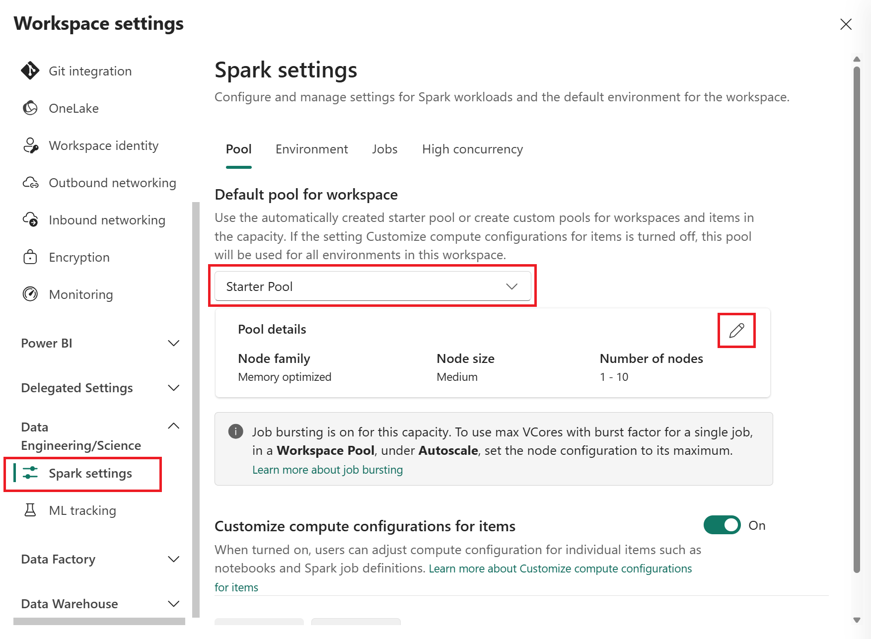 Vælg StarterPool fra Default pool for workspace dropdown-menuen for at se et overblik over starter pool-indstillingerne.