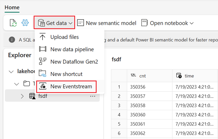 | Streamingdata | Brug Eventstream til at streame data til Eventhouse. aktivér OneLake-tilgængelighed, og opret en genvej fra Lakehouse |