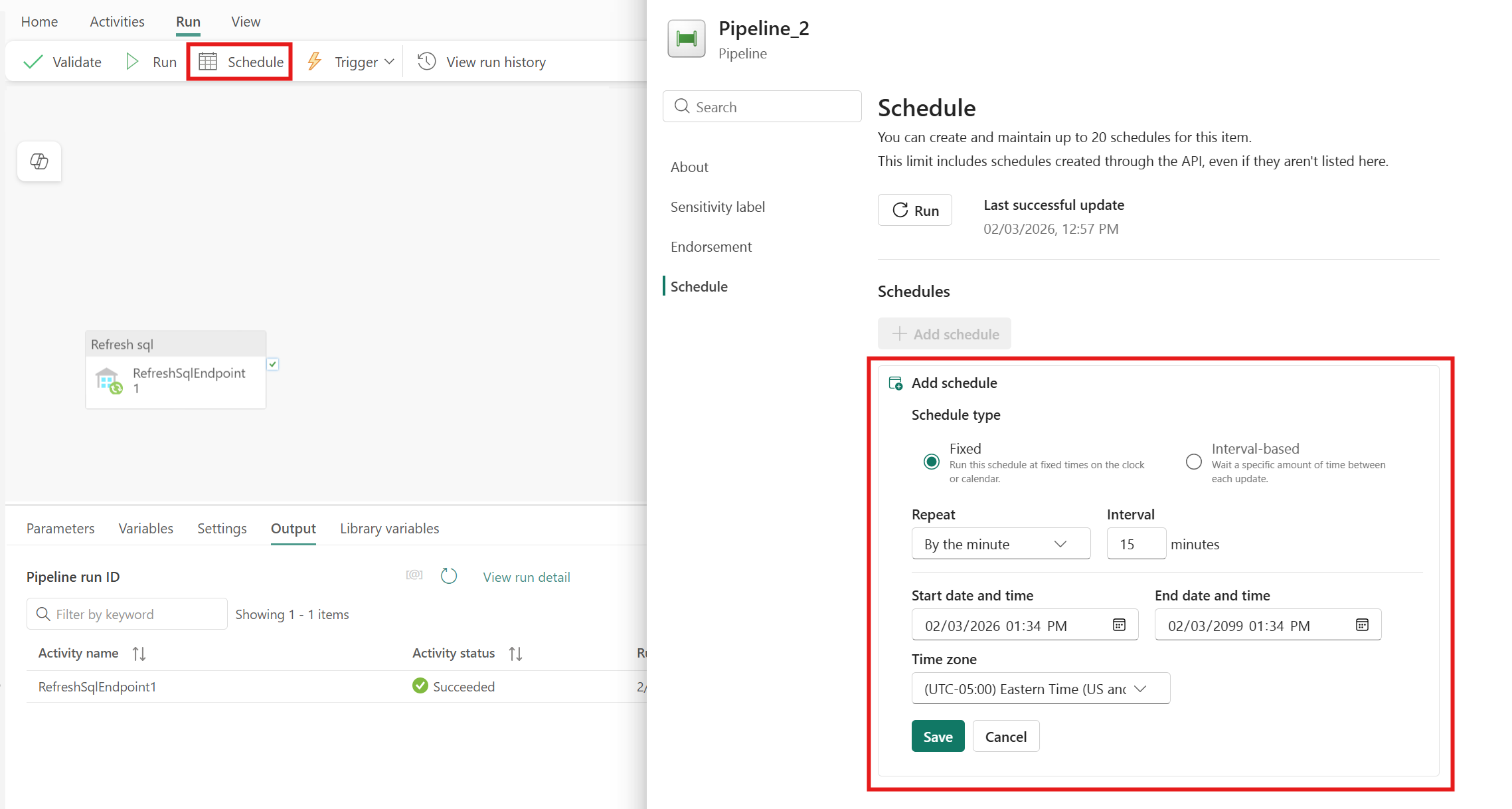 Tilføj en Refresh SQL Endpoint-aktivitet til din pipeline i brugerfladen