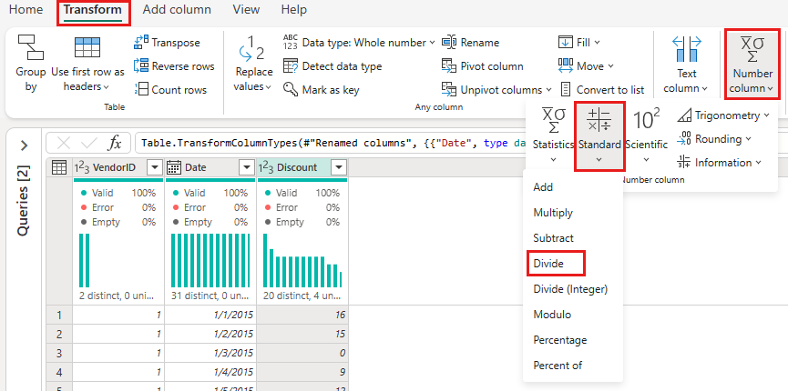 Vælg kolonnen Discount, og vælg derefter fanen Transformér i menuen. Vælg kolonnen Tal, og vælg derefter Numeriske standardtransformationer i undermenuen, og vælg Divide.