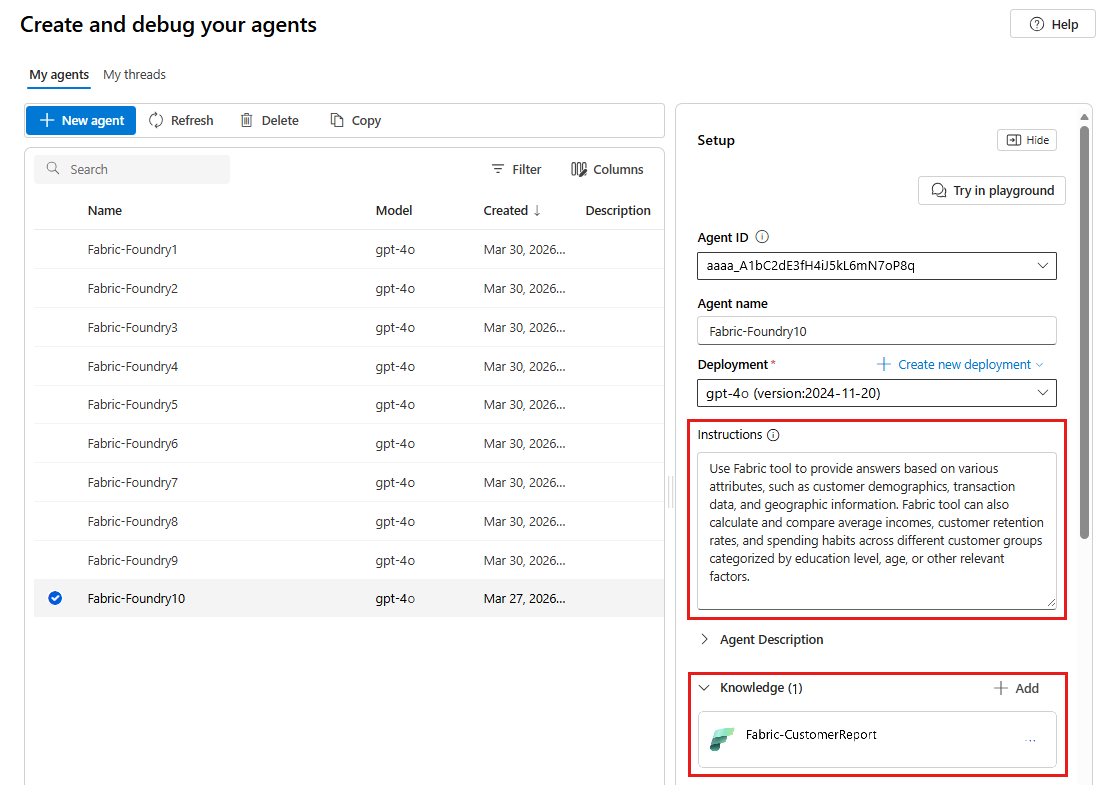Dette trin viser listen over dine eksisterende Azure AI-agenter. Du kan føje Fabric til en af disse agenter, eller du kan vælge Ny agent for at oprette en ny agent. Oprettelse af ny agent genererer et entydigt agent-id og et standardnavn. Du kan når som helst ændre dette navn. For mere information, se Hvad Azure OpenAI i Foundry-portalen er.
