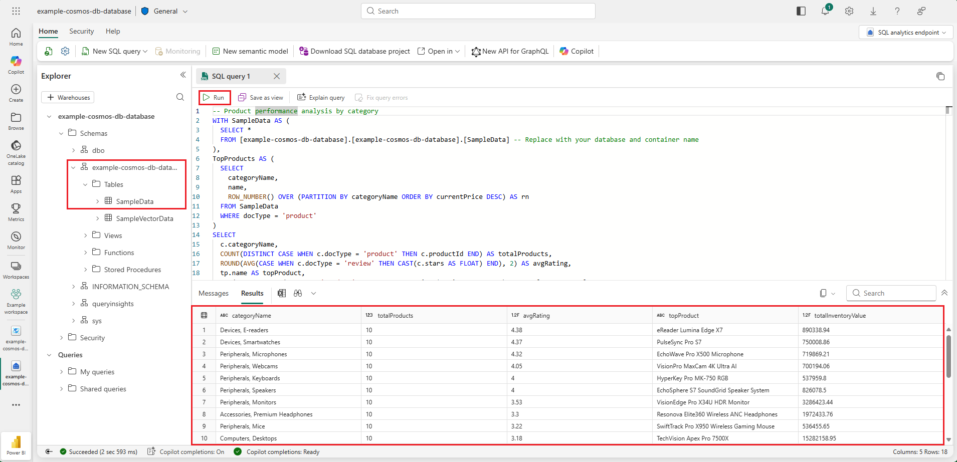 For mere komplekse analysescenarier kan du køre forespørgsler, der kombinerer flere metrikker og bruger avancerede T-SQL-funktioner. Følgende eksempel bruger det indbyggede eksempeldatasæt til at beregne produkt-KPI'er og gennemgå indsigter på tværs af kategorier. For mere information om eksempeldatasættet, se Eksempler på datasæt i Cosmos DB i Microsoft Fabric.