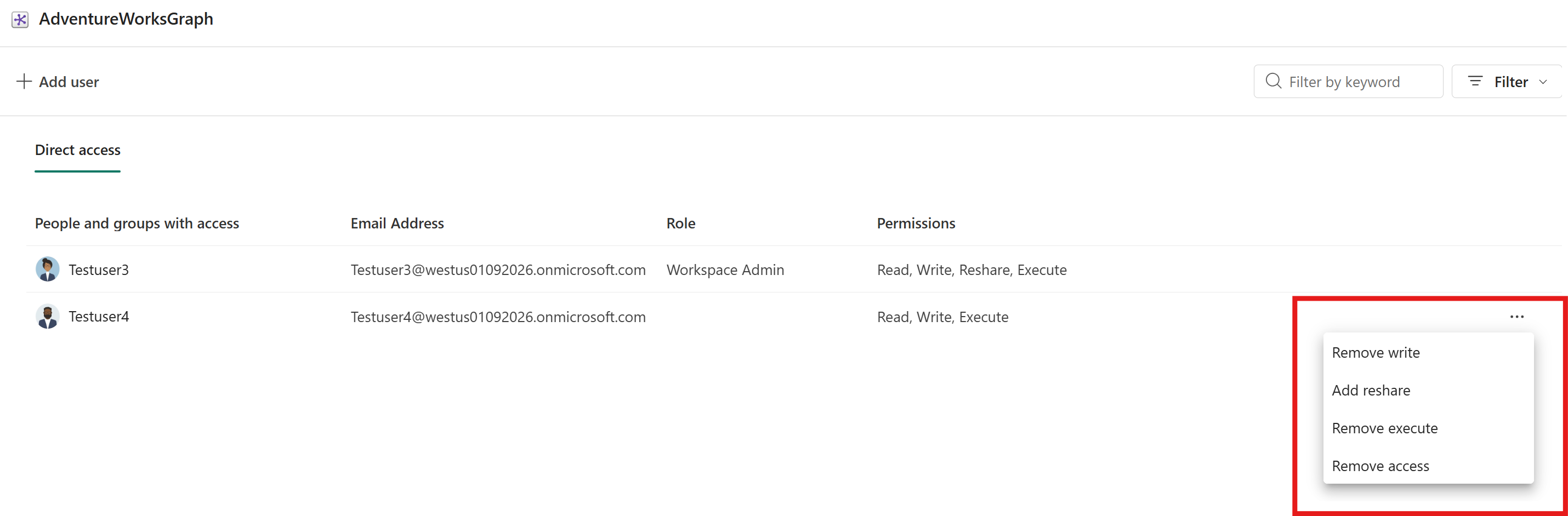 - Brugere, der har adgang gennem arbejdsområder, sammen med deres rolle og tilladelser.