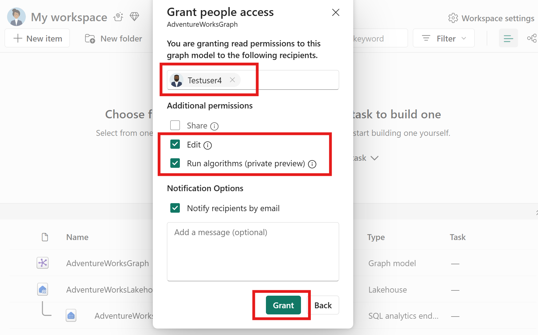 | Udføre | Kør algoritmer (privat forhåndsvisning) | Modtageren kan køre forespørgsler og algoritmer mod den forespørgelige graf. |