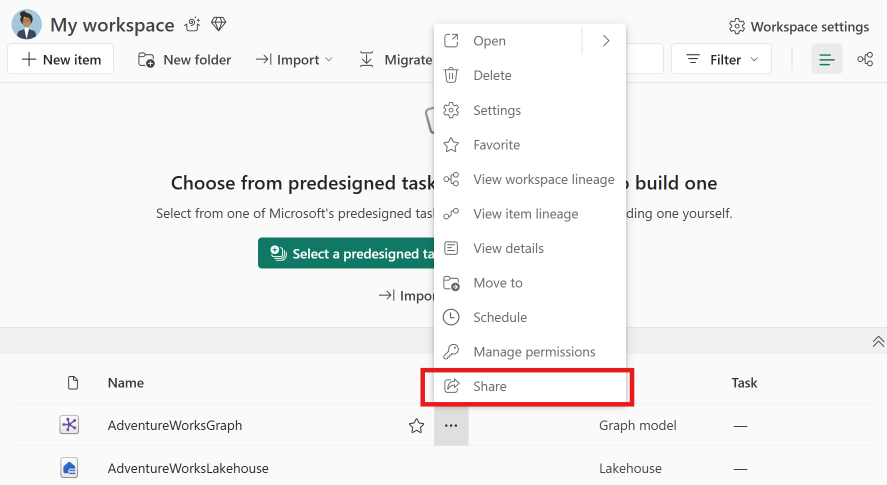 - I dit Microsoft Fabric-arbejdsområde skal du finde den grafmodel, du vil dele.