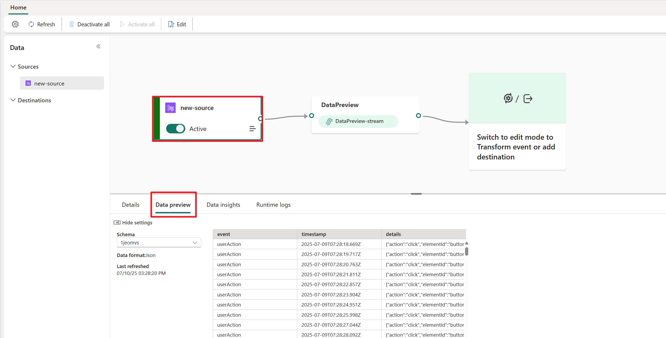 For Amazon Kinesis Data Stream-kilde kan kun beskeder i JSON-format forhåndsvises.