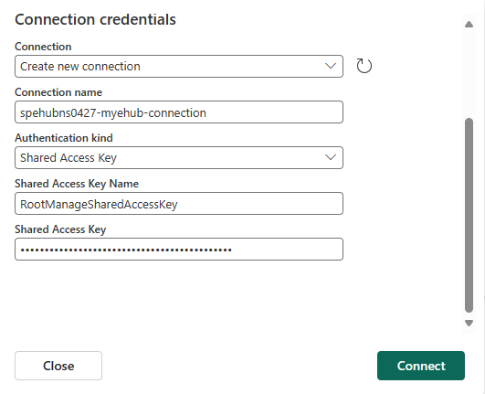 Angiv navnet på den delte adgangsnøgle for Navn på delt adgangsnøgle. For instruktioner til at få en adgangsnøgle, se Få en Azure Event Hubs forbindelsesstreng.