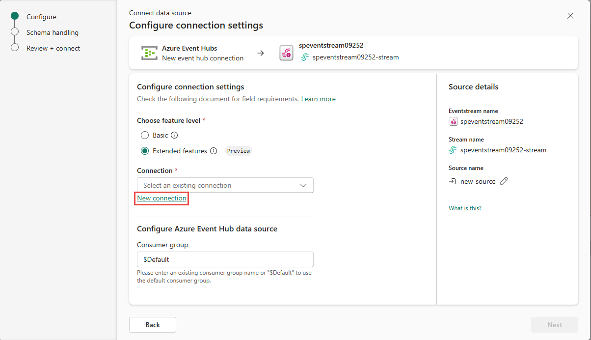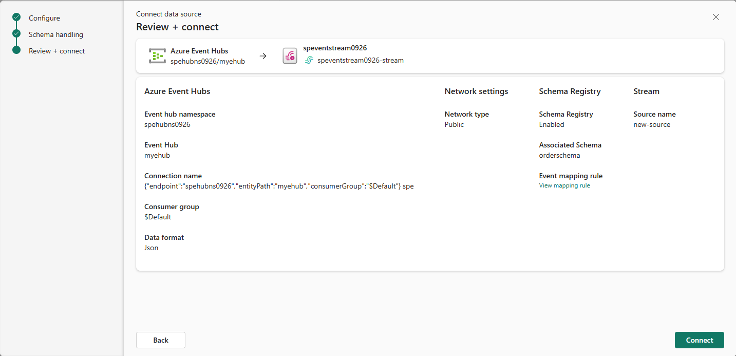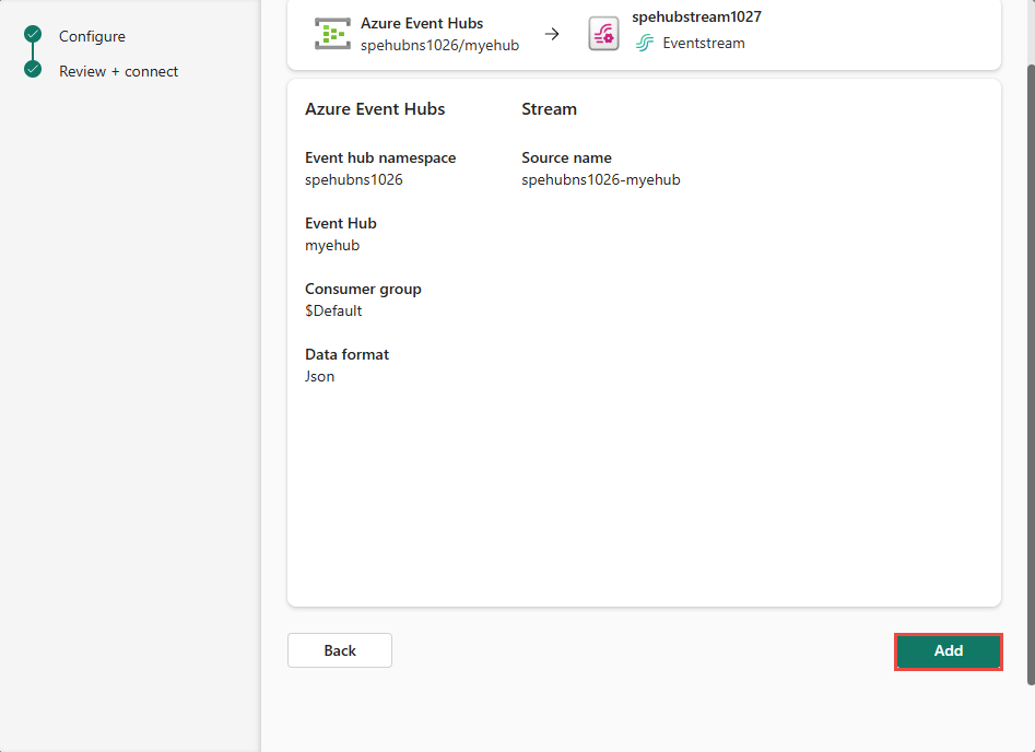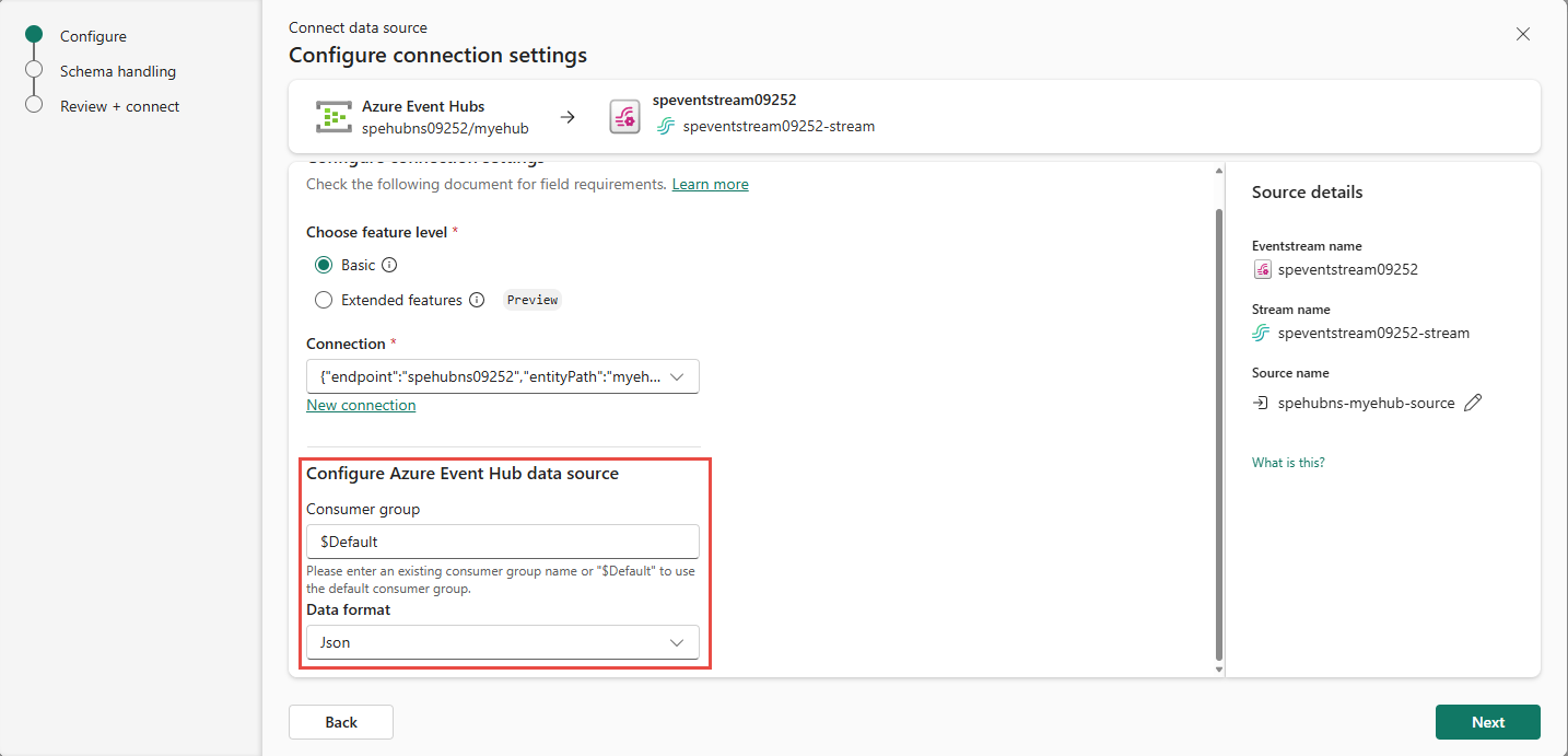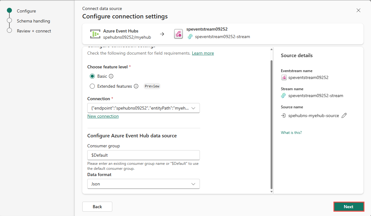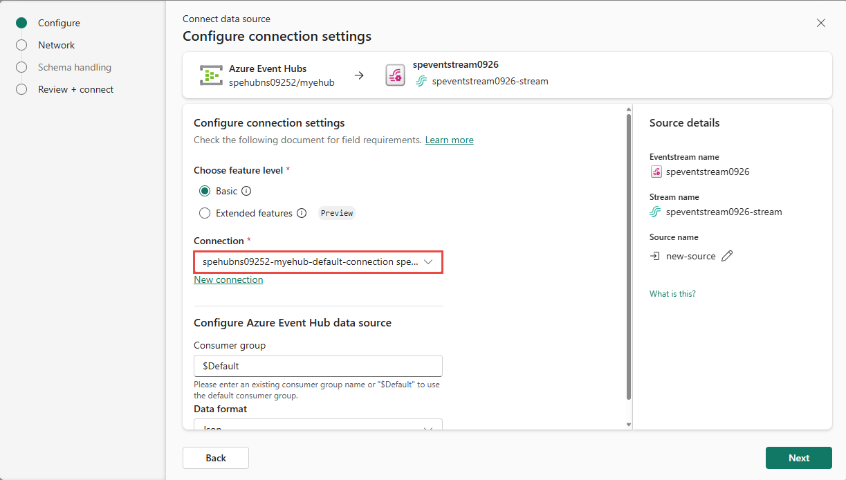 Hvis der allerede er en forbindelse til dit event hub, skal du vælge den eksisterende forbindelse. Gå derefter videre til at konfigurere dataformatet i de følgende trin.