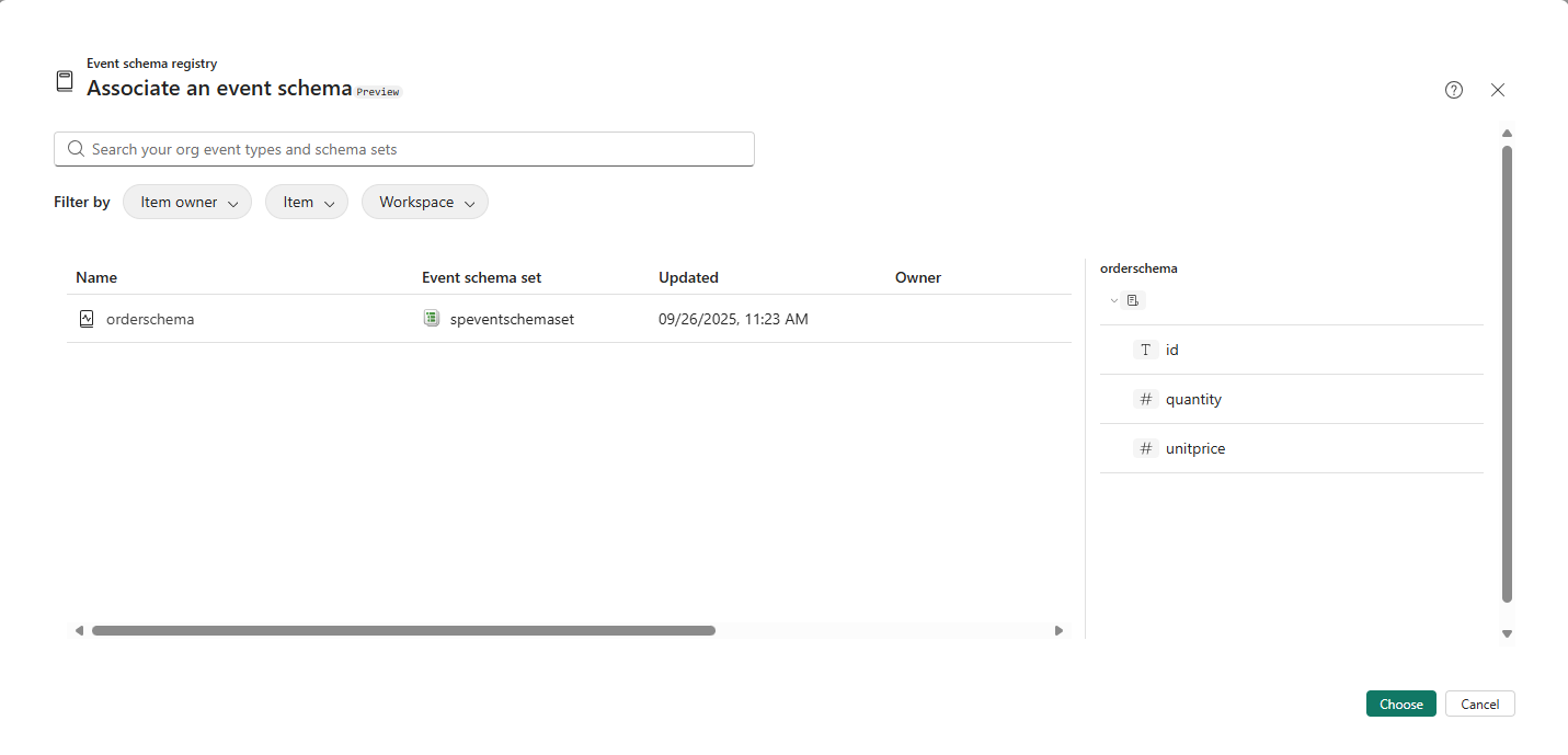 Hvis du valgte Vælg fra event schema registry-muligheden , vises panelet Associate an event schema pane. Vælg et eller flere skemaer fra registret, afhængigt af din skema-matchningstilstand, og vælg derefter Vælg nederst i panelet.