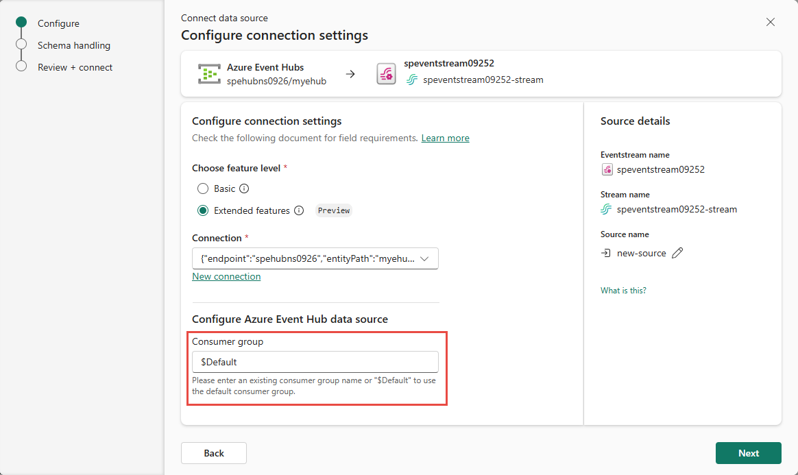 For Forbrugergruppen indtast navnet på forbrugergruppen. Standardforbrugergruppen for event hub er $Default.
