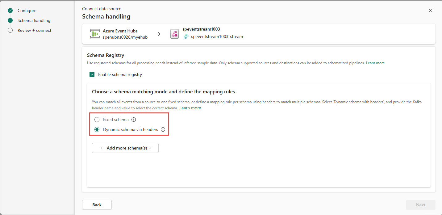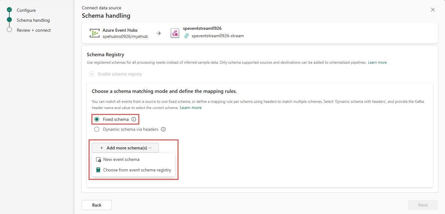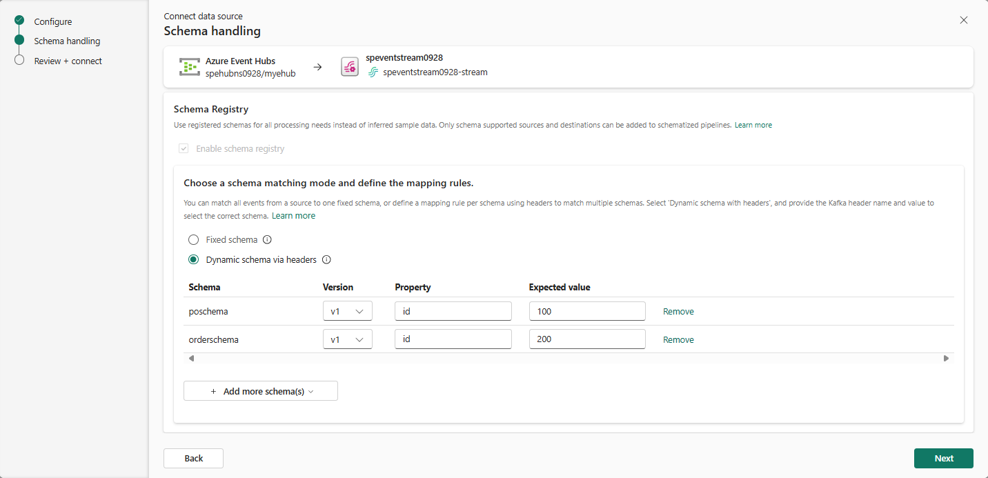 På Schema-håndteringssiden skal du angive regler til håndtering af begivenheder modtaget fra den valgte begivenhedshub, så eventstreamen kan anvende dem korrekt. Tilknytningsreglerne afhænger af, hvordan du modellerer hændelserne.