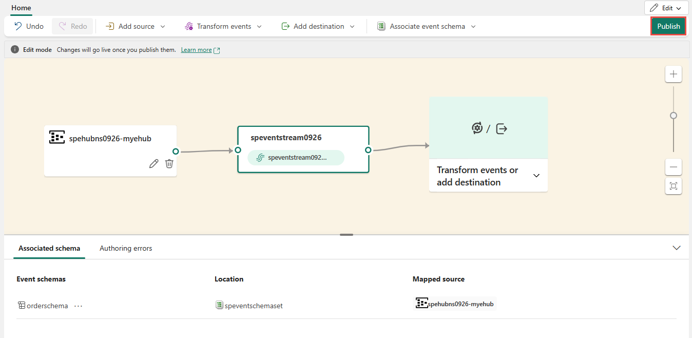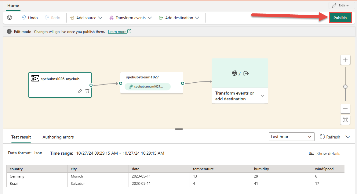 Bekræft, at Event Hubs-kilden er tilføjet til din eventstream på lærredet i Rediger-tilstand . Vælg Opdater for at vise en forhåndsvisning af dataene i event hubben. For at implementere dette nytilføjede eventhub, vælg Publicér på båndet.