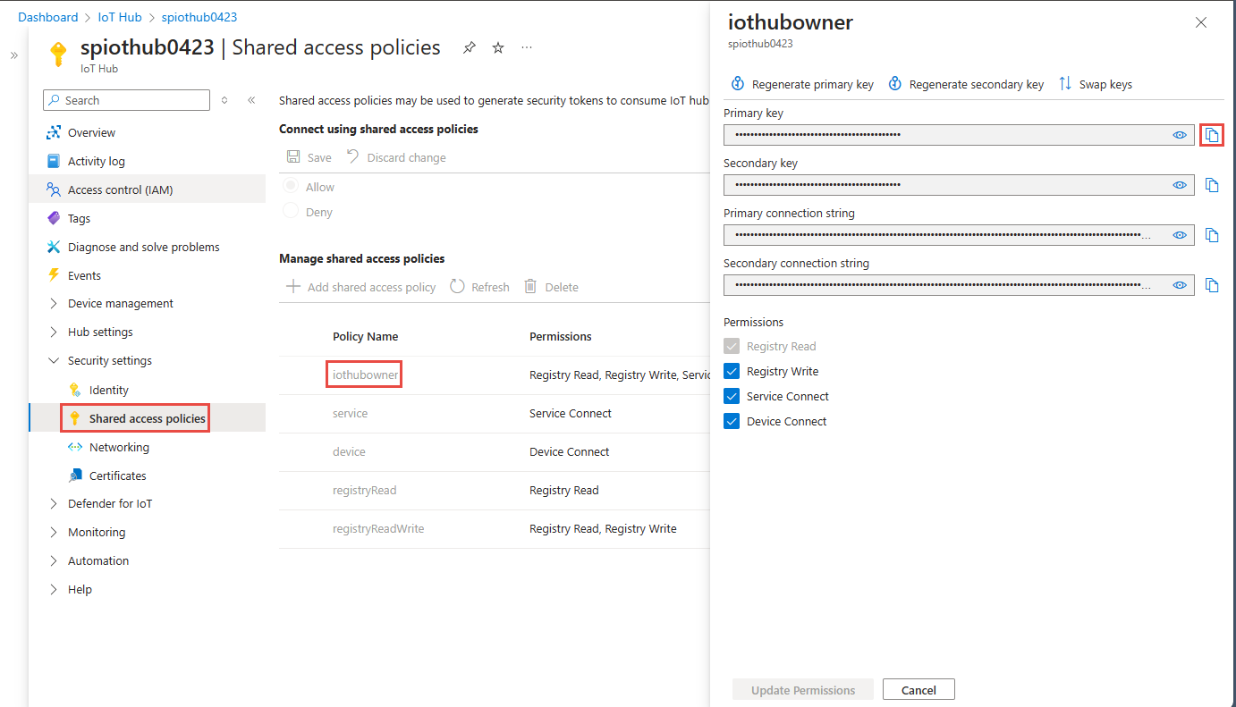 - Passende tilladelse til at få adgangsnøglerne til din IoT-hub. Hvis din IoT-hub er inden for et beskyttet netværk, skal du forbinde til den ved at bruge en administreret privat endepunkt. Ellers skal du sikre, at IoT-hubben er offentligt tilgængelig og ikke bag en firewall.