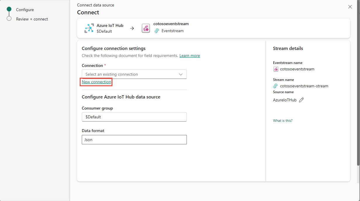 Hvis der er en eksisterende forbindelse til din IoT-hub, vælg den eksisterende forbindelse, og gå derefter videre til at konfigurere dataformatet i de følgende trin.