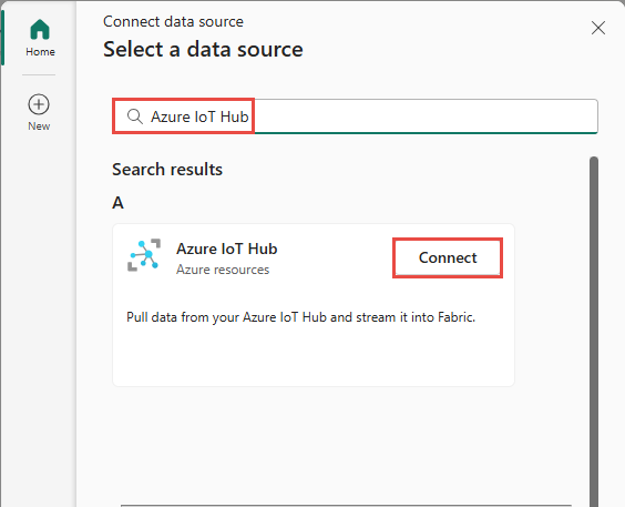 På siden Vælg en datakilde , søg efter Azure IoT Hub. På Azure IoT Hub-flisen vælger du Connect.
