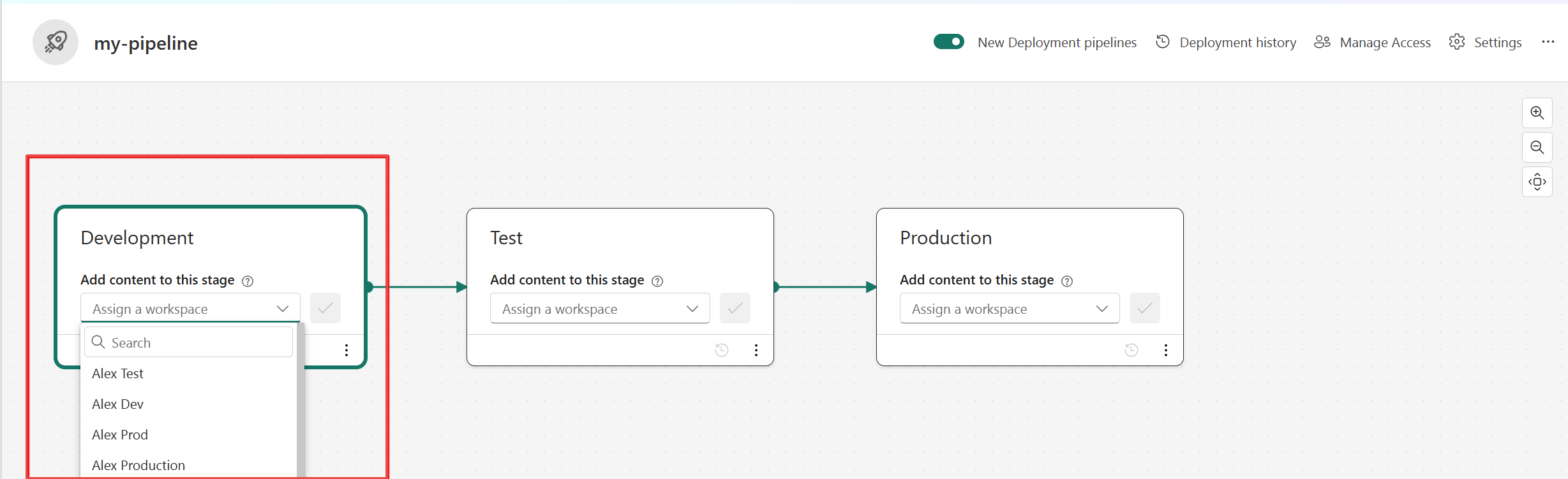 - Når du har oprettet en pipeline, kan du tildele et arbejdsområde til hver fase.