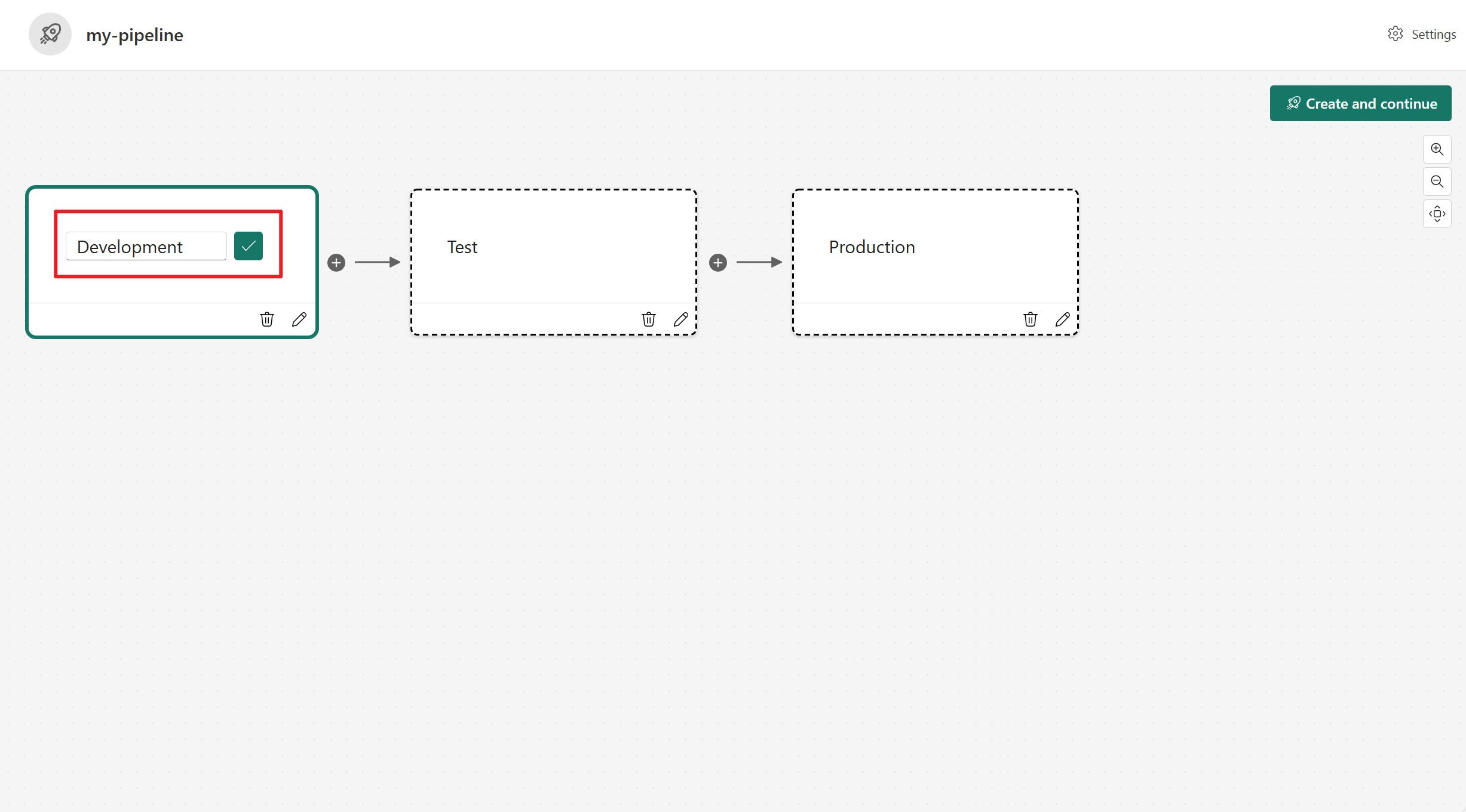 - Giv pipelinen et navn. Standardpipelinen har tre faser med navnet Udvikling, Test og Produktion. Du kan omdøbe faserne og have et vilkårligt sted mellem 2-10 faser i en pipeline. Vælg derefter Opret, og fortsæt.