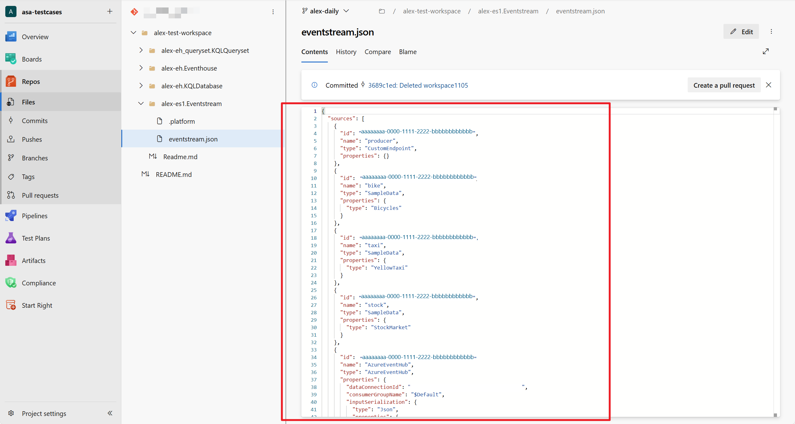 Når Eventstream-elementet er synkroniseret, kan du få vist den seneste ændring af Eventstream i dit git-lager.
