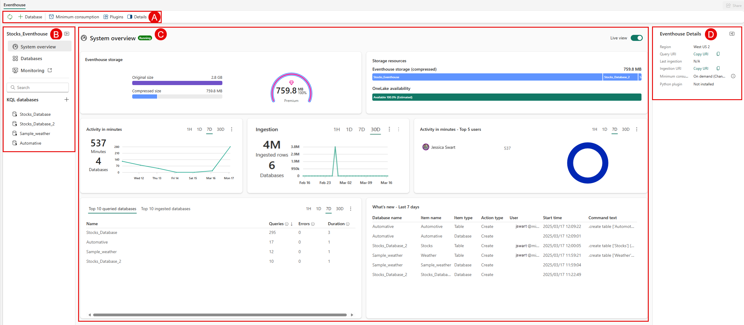 Båndet Eventhouse er din handlingslinje med hurtig adgang, der giver en nem måde at udføre vigtige opgaver på i et Eventhouse. Herfra kan du opdatere din hovedvisning, planlægge kapacitetsplanlæggeren, tilføje databaser, tilføje plugins og sammenklappe eller udvide detaljeområdet.