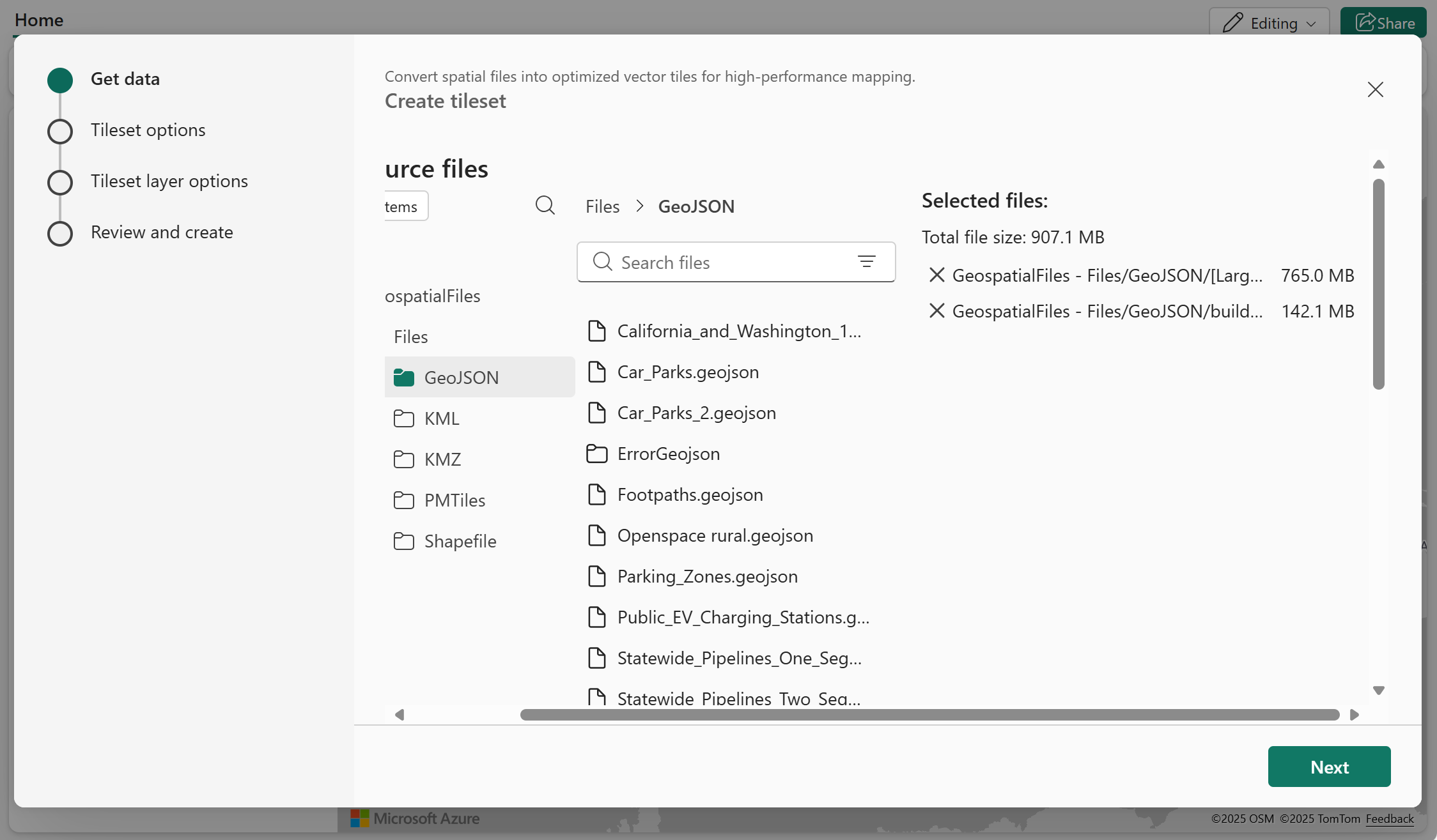 Start med at oprette forbindelse til mindst ét søhus, der indeholder GeoJSON-filer. Du kan vælge flere filer, der skal konverteres til et vektorflisesæt.