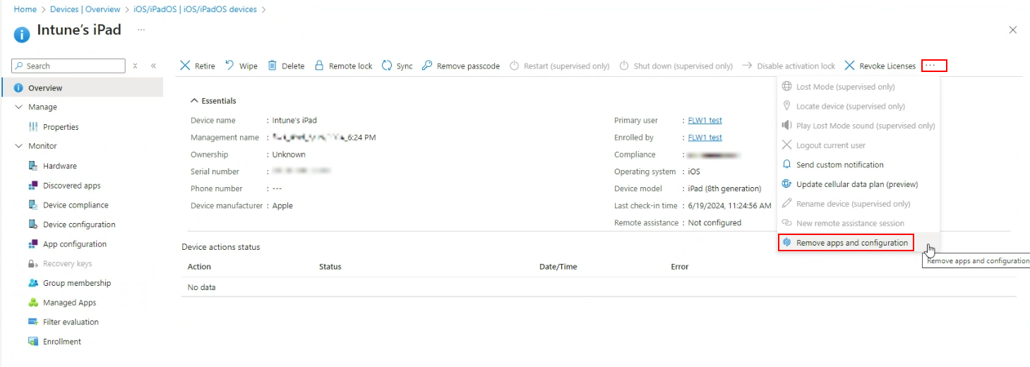 - At the top of the device overview pane, find the row of remote action icons. Select Remove apps and configuration.
