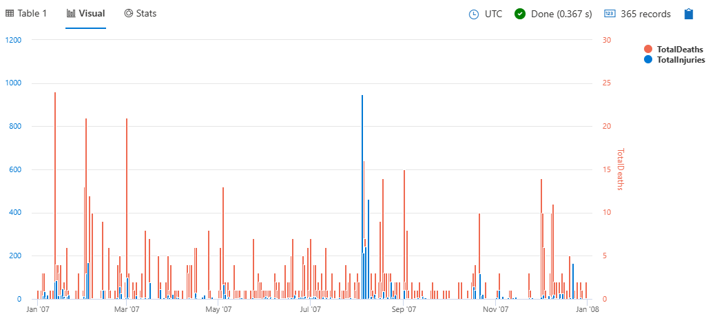 This query provides a daily summary of storm-related injuries and deaths, visualized as a column chart with split axes/panels for better comparison.