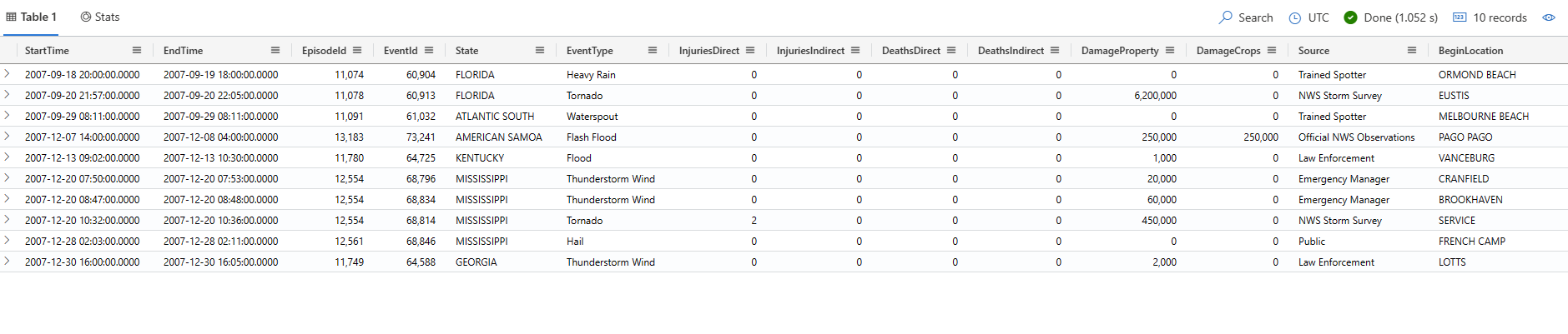 This query outputs a snapshot of the first 10 storm event records, displayed in a table format.