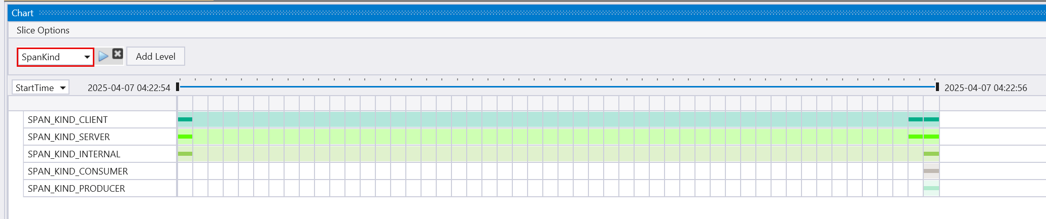 In the time pivot, the Slice options are automatically set to SpanKind as the column to pivot by.