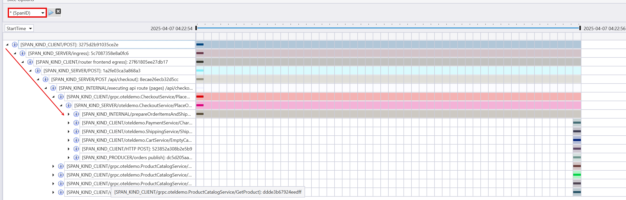 You can show the hierarchy of the individual spans in the same OpenTelemetry trace, by changing the Slice options to (SpanID). The hierarchy is expandable to display the spans that make up the entire trace. For each span you can see the span kind, span name, and span ID as the span header.