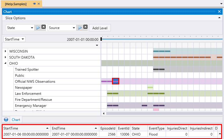 This query outputs a visualization of flood events in the specified Midwestern states, displayed as a time pivot chart.