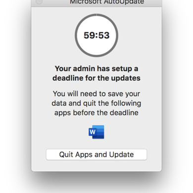 | Comments | MAU is calculating deadline dates based on the day updates are found on that device. Not from when Microsoft released the patches. Starting from StartAutomaticUpdates number of days before deadline is reached, there will be a prompt displayed to user every 12 hours |