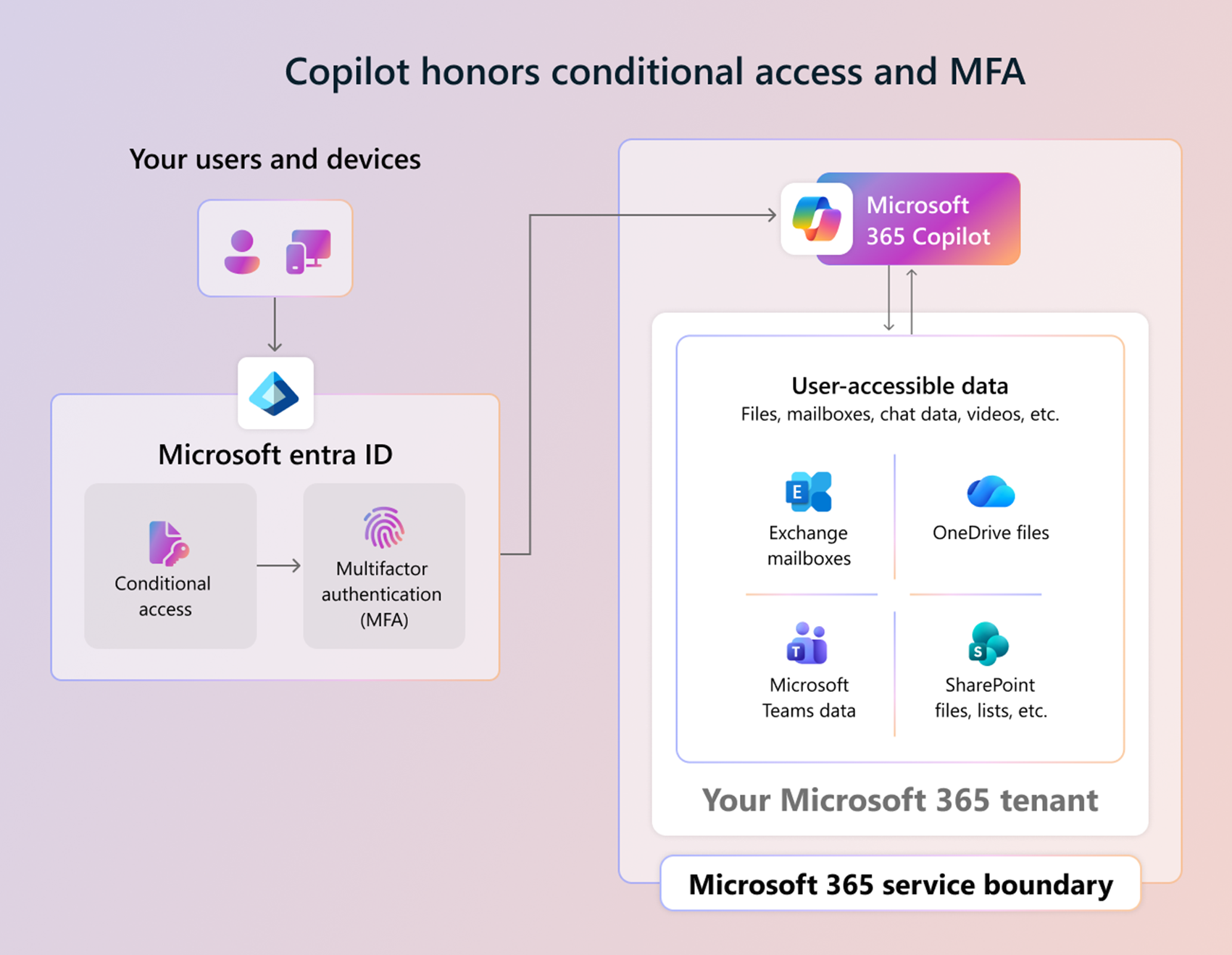 I denne artikel beskrives det, hvordan Microsoft 365 Copilot fungerer, herunder dataflowet i en brugerprompt, hvordan Copilot får adgang til data, og hvordan Copilot hædrer betinget adgang og multifaktorgodkendelse (MFA).