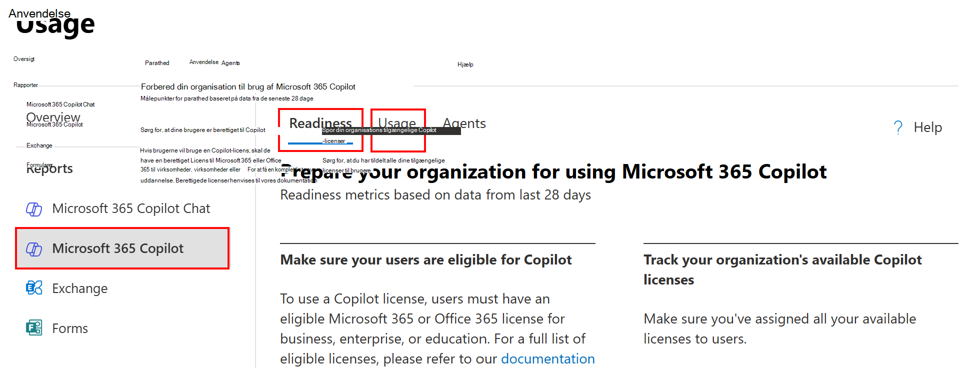 Vælg Microsoft 365 Copilot>Readiness eller Usage: