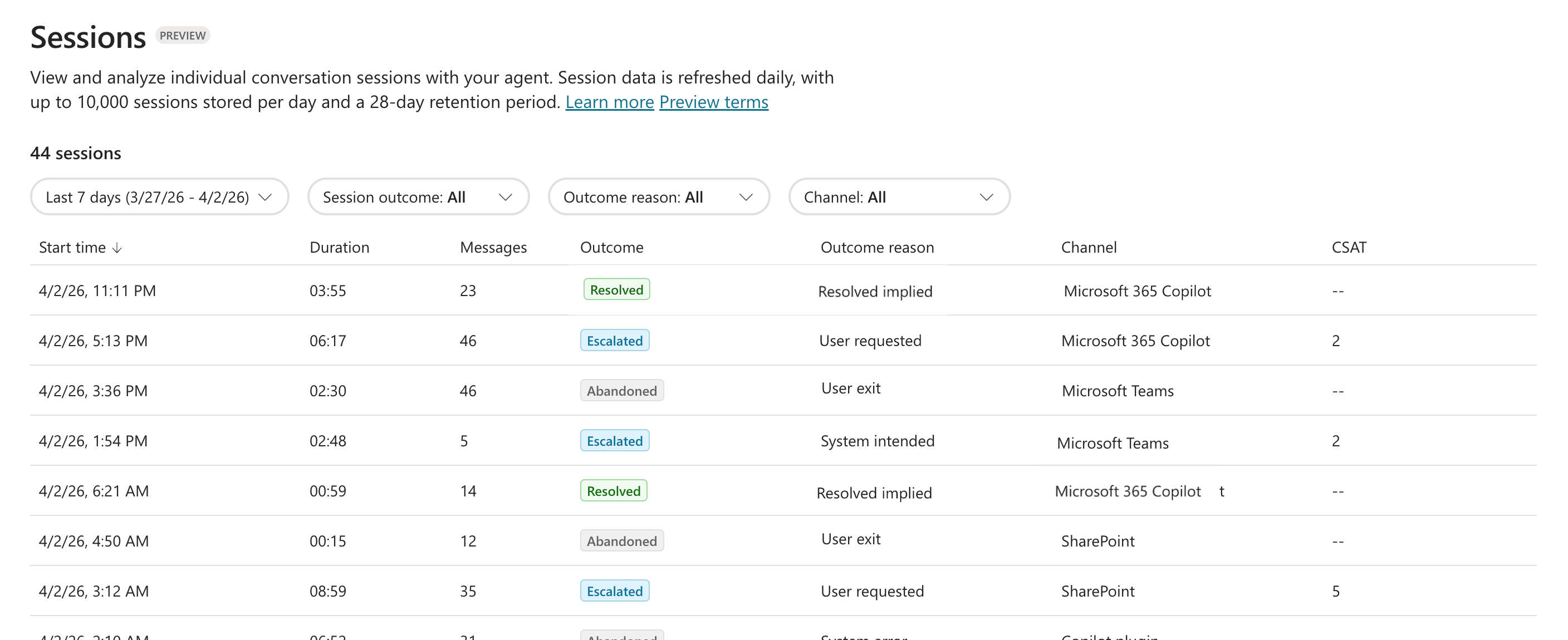 Brug sessionslisten til at analysere agentens ydeevne og undersøge ved at undersøge de data på sessionsniveau, der fører til et sessionsresultat (resolved, escalated, abandonedeller unengaged). Filtrer f.eks. efter kanal, fokuser på lave CSAT-sessioner, og analysér derefter i sessionsdata for at få indsigt i, hvorfor kunder i disse kanaler kan have en dårlig oplevelse.