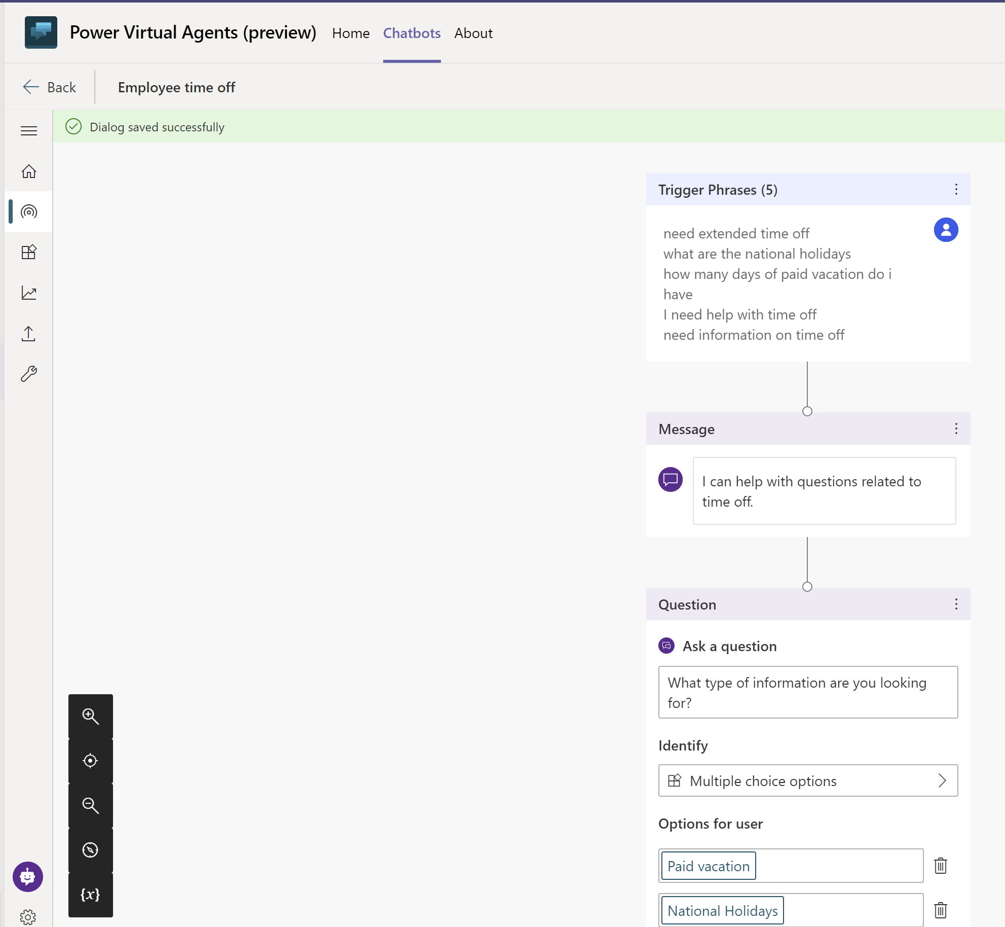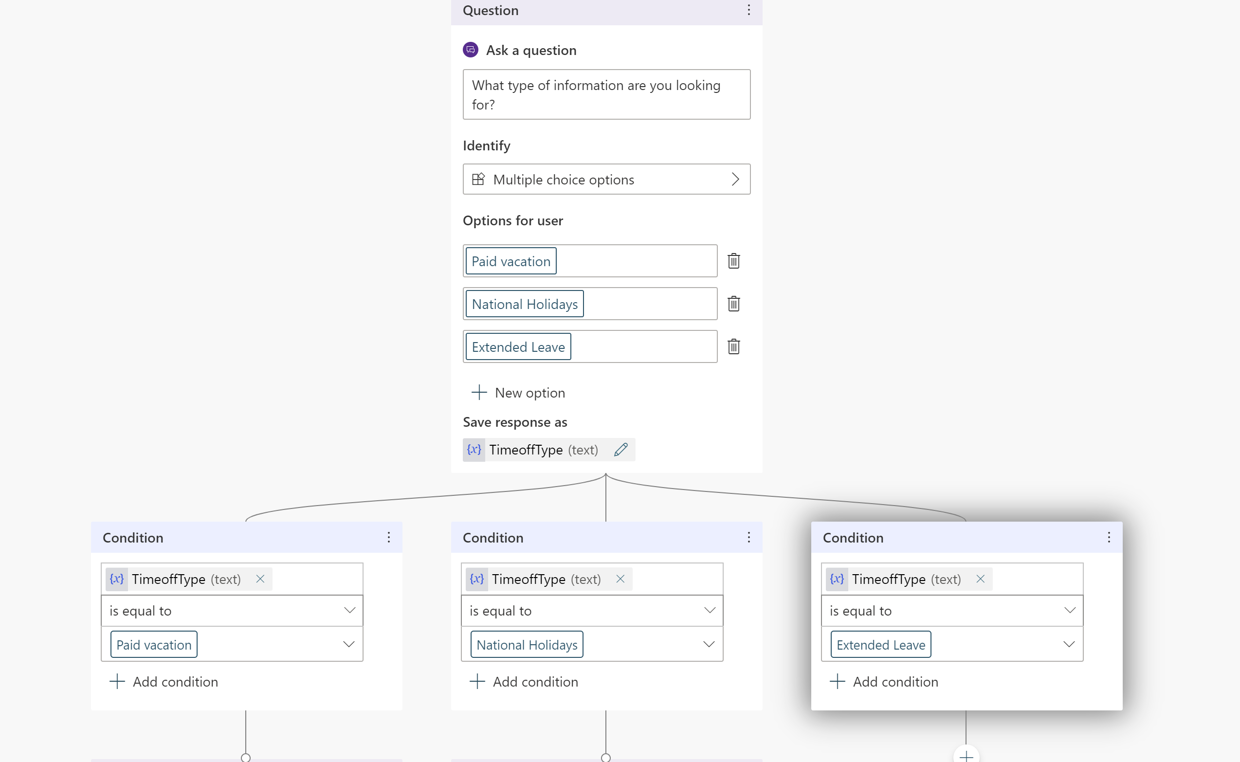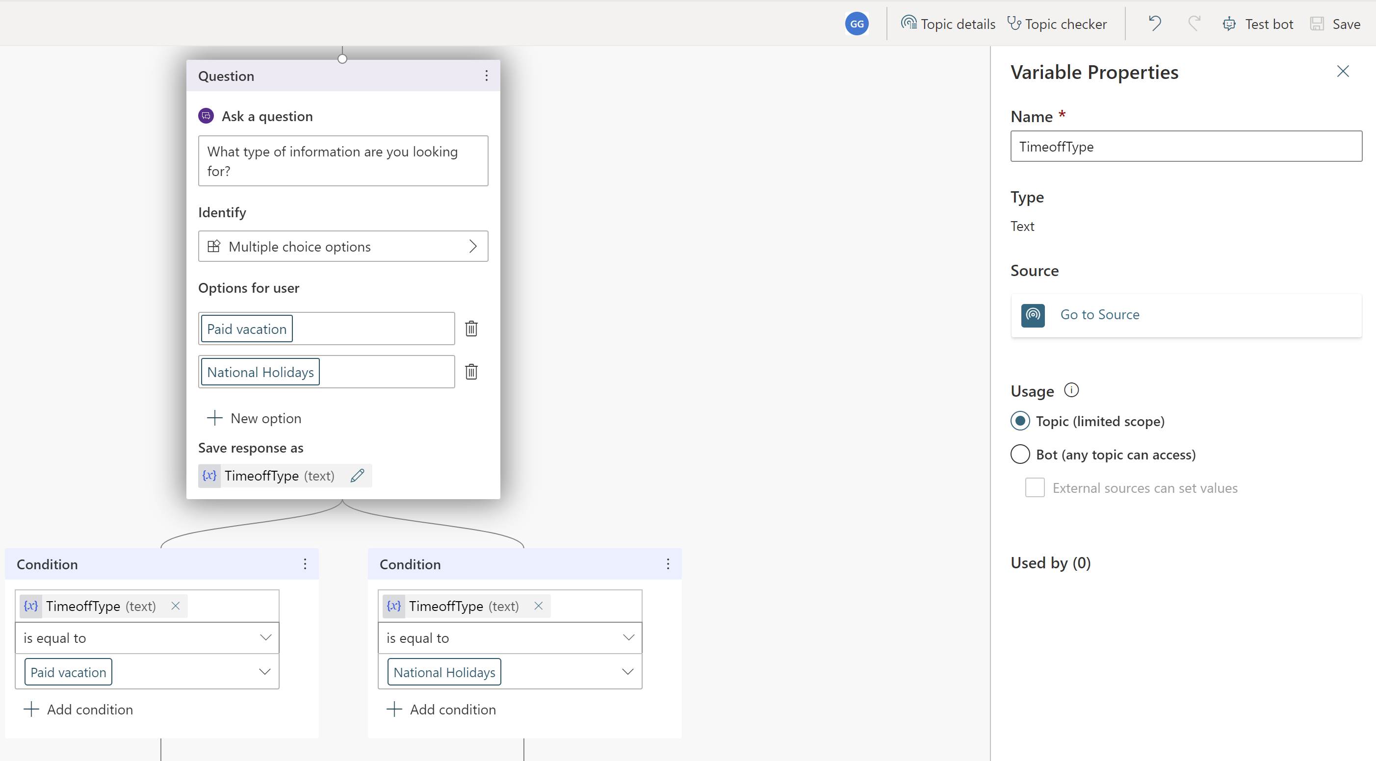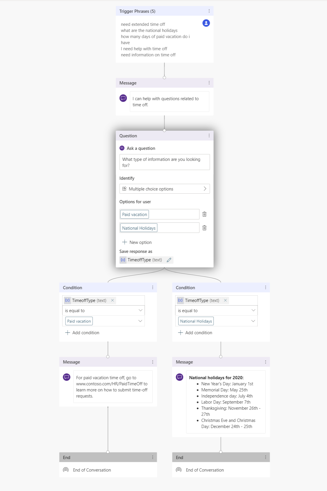 TimeOffType. Luk panelet Variabelegenskaber , så kan du se ændringerne afspejlet på oprettelseslærredet.Du kan tilføje forskellige svar for de enkelte muligheder. I forbindelse med betalt ferie kan chatrotten pege medarbejderne til et internt HR-websted for at slå betalte fridagspolitikker op.