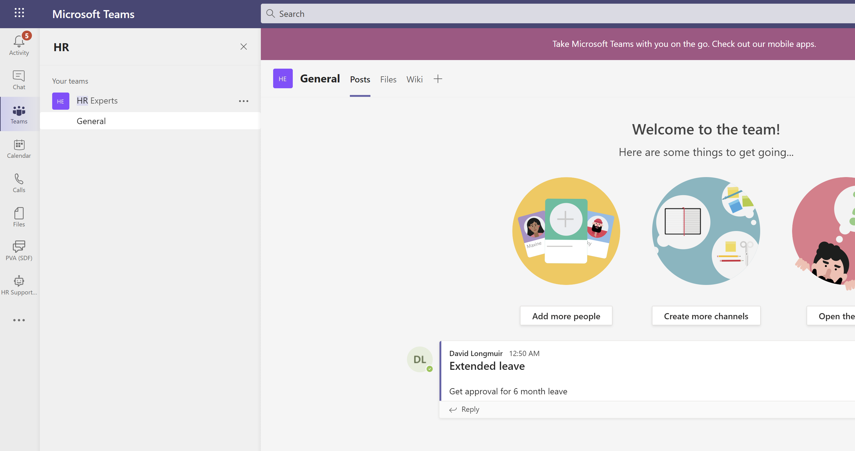 Copilot Studio-chatbots kan foretage handlinger ved at tilføje handlinger til et emne. I dette eksempel tilføjer du en tidligere grundlæggende handling, der giver en HR-ekspert besked. Denne grundlæggende handling sender et tilpasset kort til HR-ekspertkanalen i Teams, så eksperterne kan få at vide, at de skal kontakte en bruger.
