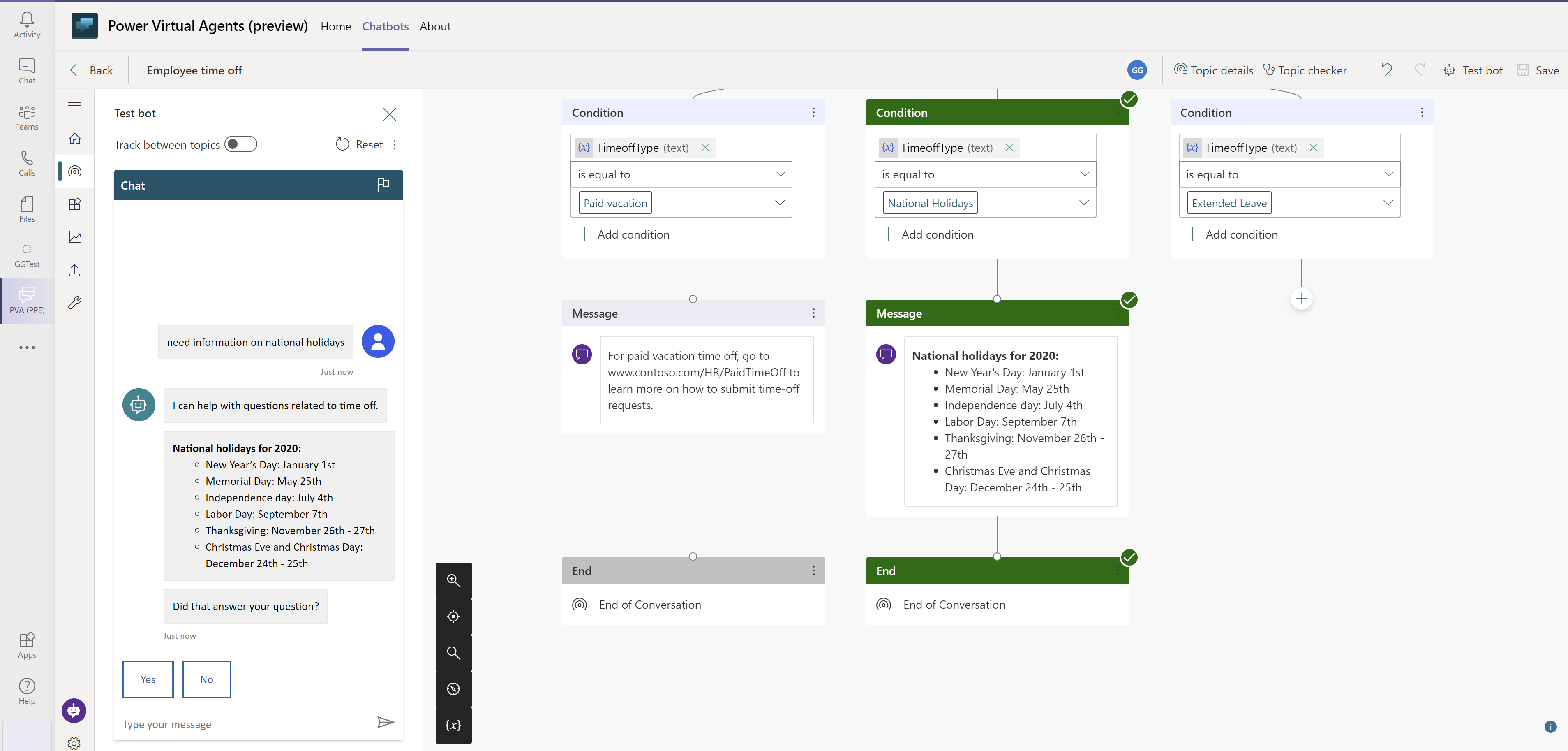 Emnet forgrener sig afhængigt af brugerens svar. Du kan åbne variablen TimeOffType for at se værdien af Betalt fritid af brugeren. Hvad sker der, hvis brugeren allerede har gjort det klart, at denne leder efter nationale helligdage i deres forespørgsler? Brugeren kan blive irriteret, hvis chatrobotten beder dem om at gentage sig selv. Lad os give det et forsøg.