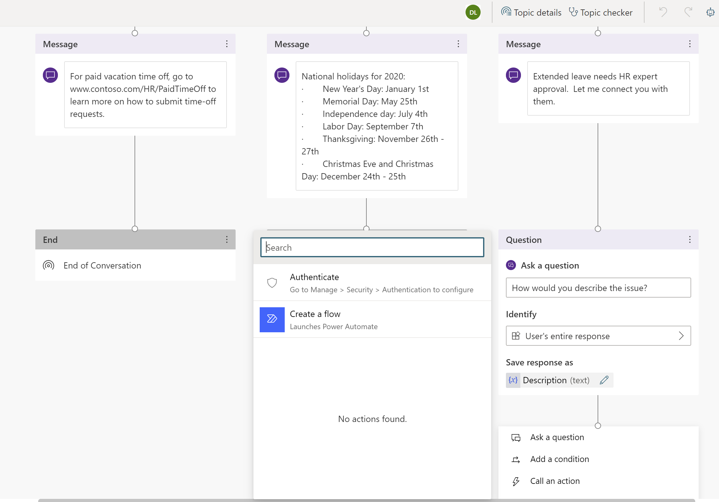 En chatrobot leveres med en samling af emner, der definerer robottens interaktion med brugere. Lad os opbygge et emne, der besvarer medarbejdernes spørgsmål om fridage.