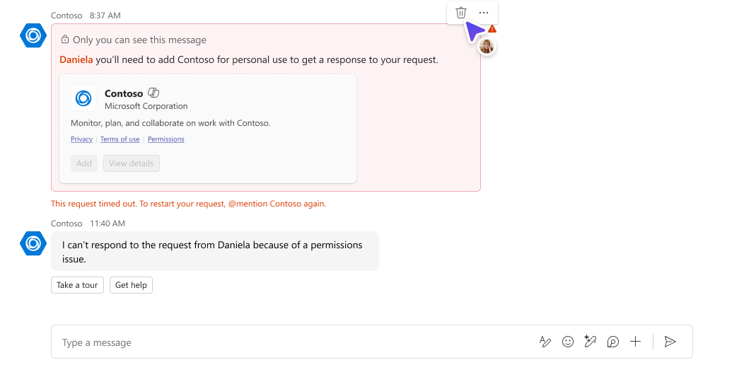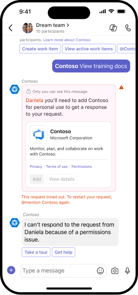 If the user declines, or the request times out, the user must @mention the bot again to grant permission for token acquisition. The group is able to see a bot message that the authentication wasn't successful.