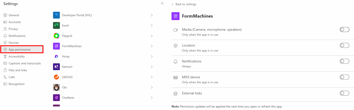 A user can manage device permissions in Teams settings by selecting Allow or Deny permissions to specific apps.
