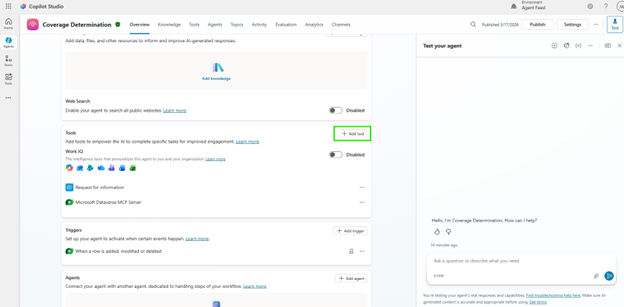 Agenten udløses automatisk, når der sendes et nyt krav. Den henter den relevante politik, påtegninger og understøttende dokumenter fra Dataverse og derefter årsager til dem for at opnå en dækningsbestemmelse, kontrollere, om politikken var aktiv, om den påståede fare er dækket, og om eventuelle dokumentkonflikter påvirker tilliden til resultatet.