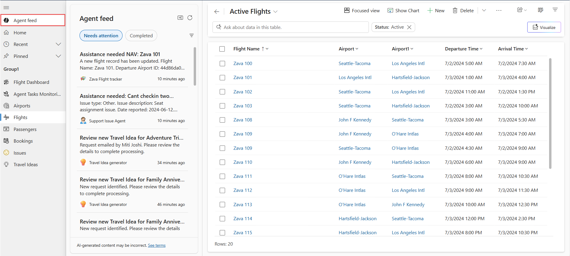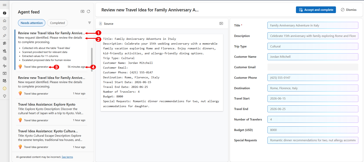 - Agentanmodninger om menneskelig bistand og logføringsopgaver til menneskelig gennemgang. I agentaktiverede apps skifter brugerfokus fra at udføre arbejdet til at overvåge og prioritere agentdrevet arbejde. Agenter hjælper med automatiseringer og organiserer arbejde og sikrer, at forretningseksperter forbliver involveret i beslutningstagning og kritiske handlinger.