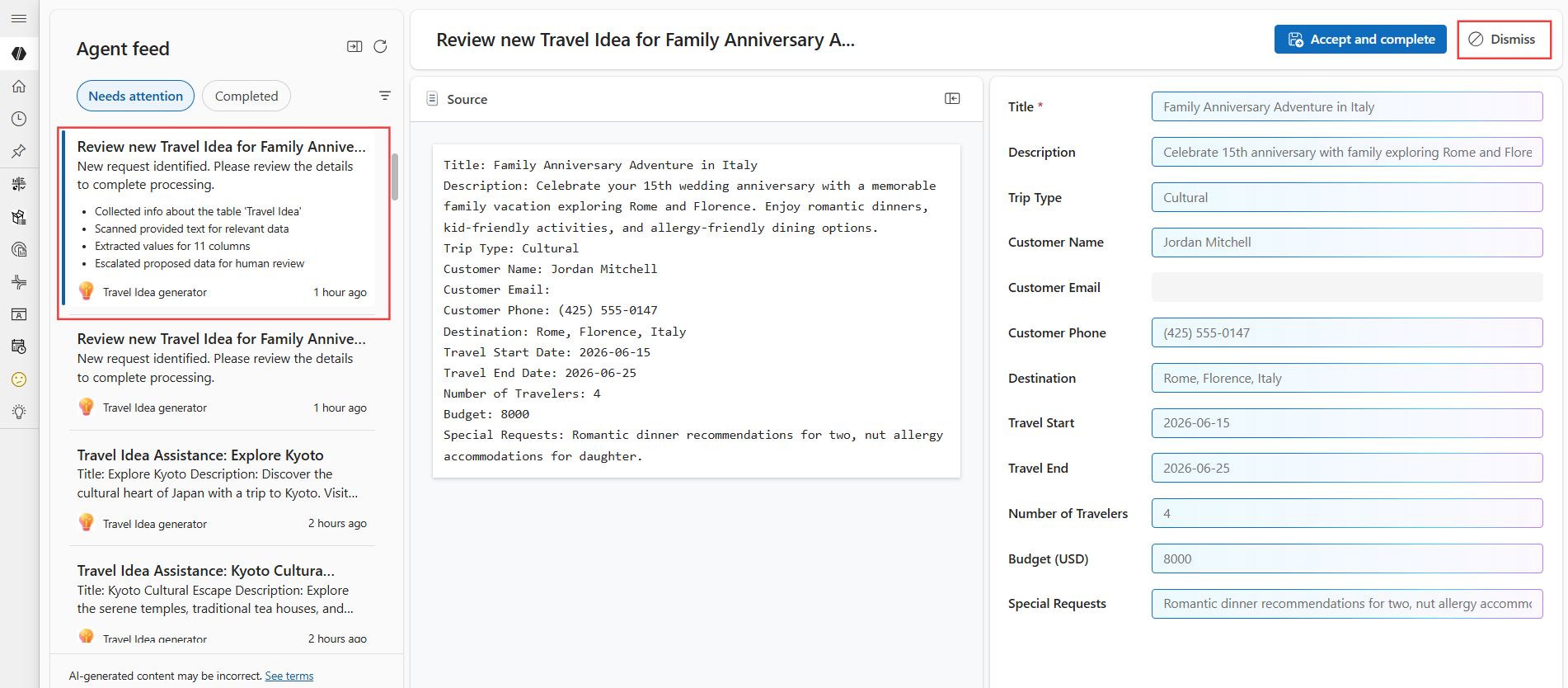 Afvis: Fjern en dataindtastningsopgave, der er logført via invoke_data_entry mcp-værktøj, fra afsnittet Kræver opmærksomhed , hvis det ikke længere er relevant. Knappen Afvis er tilgængelig i den agentrude, der er knyttet til agentfeedopgaven.