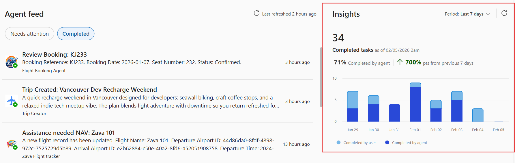 Agentfeed muliggør samarbejde mellem menneskelige agenter i apps ved at oprette agentoprettede opgaver, som brugerne kan gennemse, validere og fuldføre. Ved hjælp af agentfeed fungerer apps som en samarbejdsoverflade, hvor brugerne overvåger og interagerer med agentarbejde via et samlet, opgavebaseret feed.