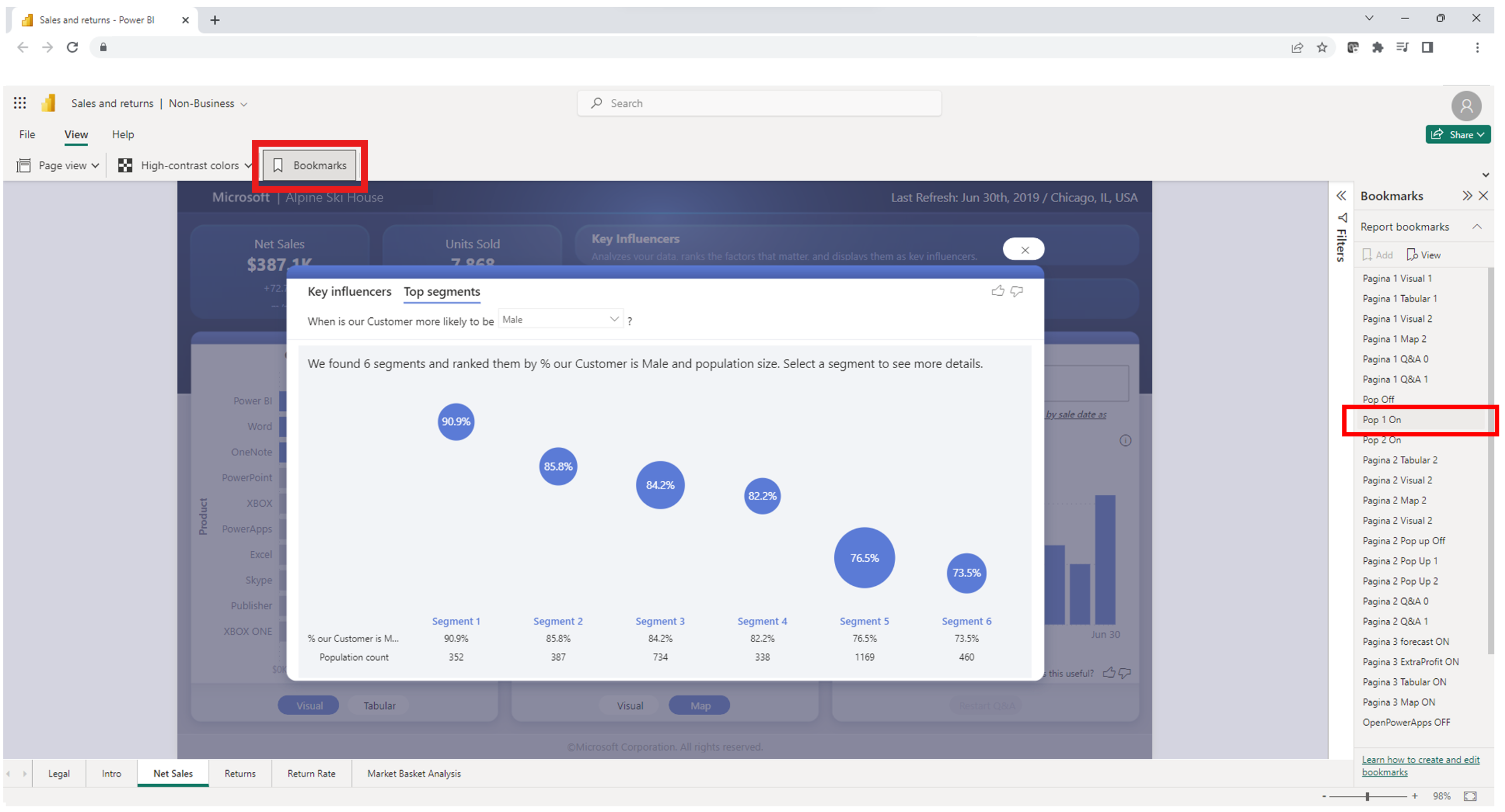 Hvis du vil have vist gemte bogmærker, skal du vælge knappen Bogmærker i øverste venstre hjørne af rapporten. Når du har valgt knappen, vises ruden Bogmærker i højre side af browseren. Du kan vælge et bogmærke, der er oprettet af rapportforfatteren. Hvis du vælger et af bogmærkerne, vises en angivet filtreret version af den rapport, der er tildelt til bogmærket.