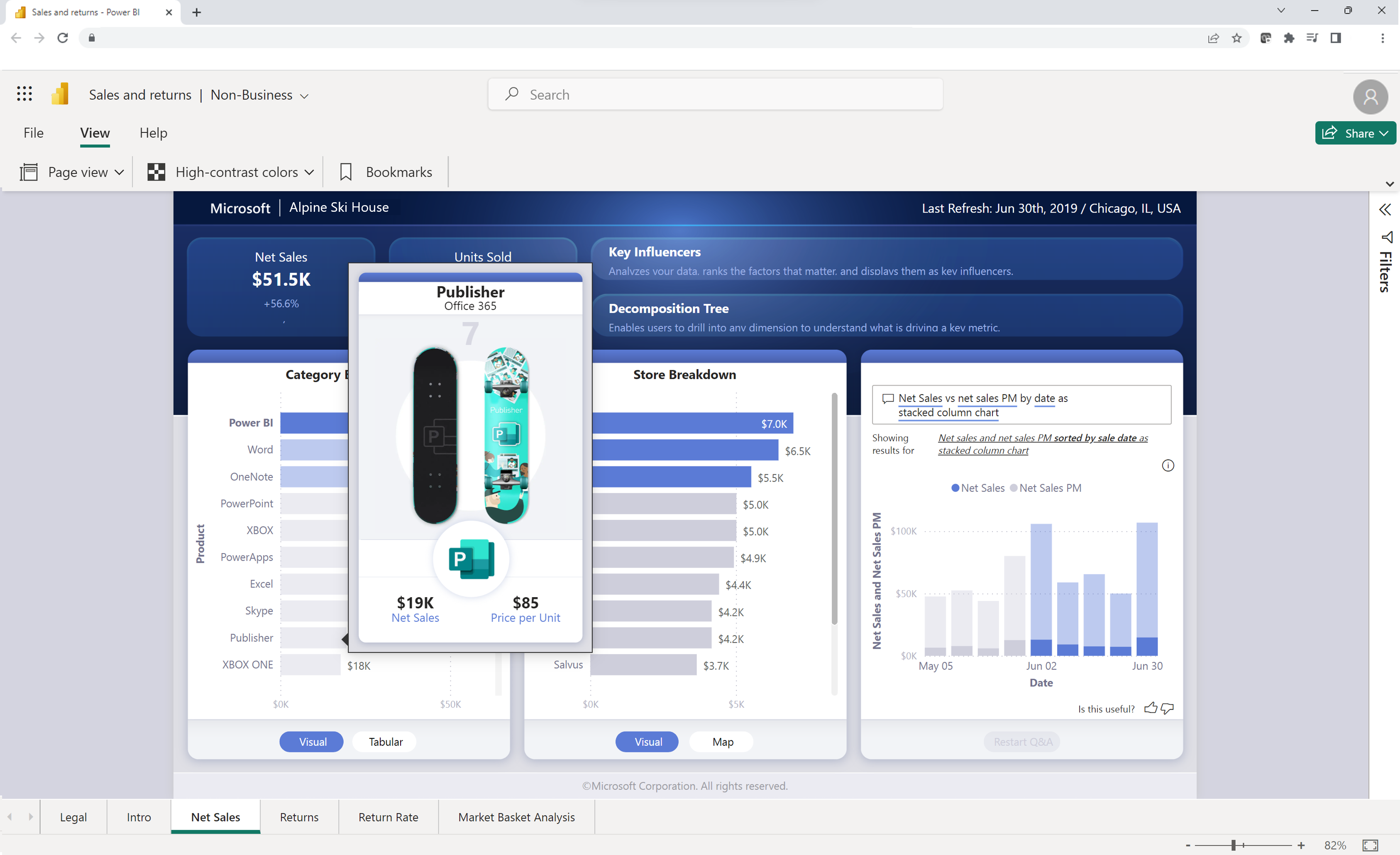 Når rapporten er åben, kan du interagere med visualiseringerne og udforske de underliggende data for at afdække vigtige oplysninger.