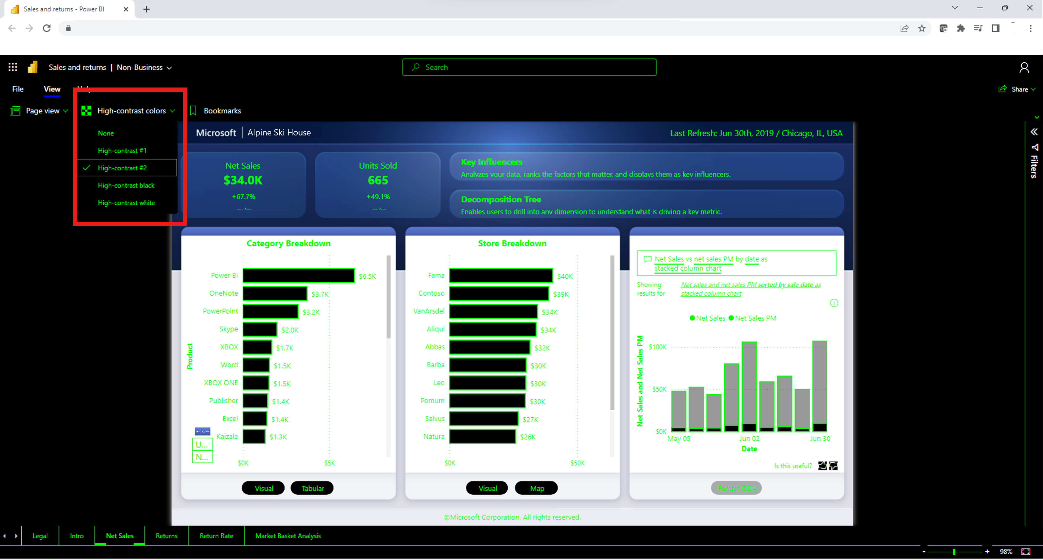 Du kan ændre din rapport, så den indeholder farver med stor kontrast. Hvis du vil ændre farven, skal du vælge en af indstillingerne på knappen Farve med høj kontrast i øverste venstre hjørne af rapporten.